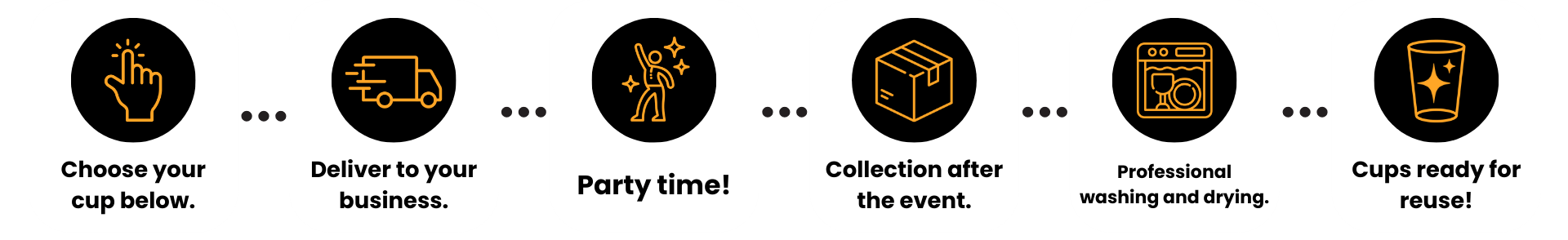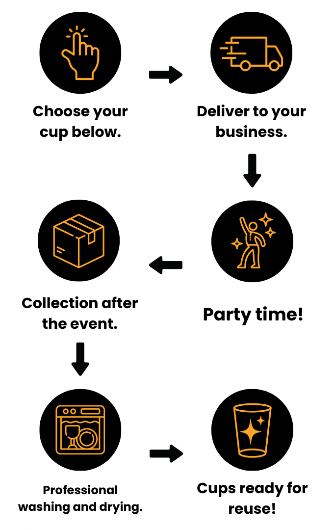 Post-Event Collection: Pack your dirty cups in the boxes they came in, ready for collection. No need to wash them!